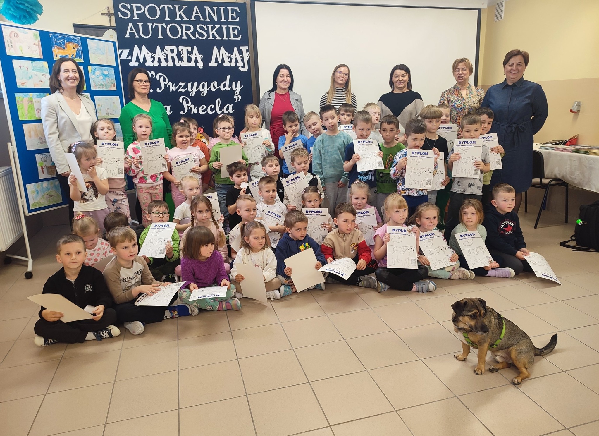Dzieci z radością wysłuchały opowieści o przygodach psa, a także wykazały się wiedzą o tych czworonogach, odpowiadając na pytania. W nagrodę każdy z uczestników otrzymał dyplom i pamiątkową naklejkę, ukazującą oczywiście Precla.