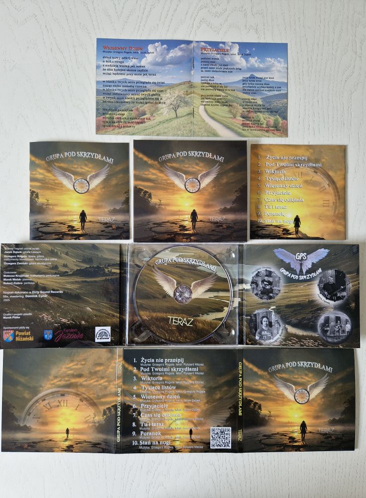 Ukazała się właśnie druga płyta jeżowskiej Grupy Pod Skrzydłami "Teraz". To 10 nowych utworów, w znanej i lubianej przez wielu konwencji poezji śpiewanej, które poszerzają repertuar zespołu, mającego w dorobku płytę "Blaski i cień" (aż 16 utworów). Wydana na koniec wakacji, a więc tuż przed "sezonem", czyli w dobrym momencie, by "iść w świat". Płyta wygląda pięknie za sprawą projektu Marka Piśko. Nie chodzi tylko o kolor, piękne pejzaże, ale całą kompozycję, projekt graficzny. A tym razem musiał on być wzbogacony, bo i płyta jest pod tym względem bogatsza - zawiera bowiem wkładkę z tekstami wszystkich piosenek. Muzyka to oczywiście dzieło Grzegorza Rogali, który w zespole jest wokalistą, gitarzystą, gra na instrumentach klawiszowych i harmonijce ustnej. Jest też autorem tekstu do jednej piosenki. Cztery piosenki na płycie "Teraz" napisał autor tekstów wszystkich piosenek z pierwszej płyty - Jacek Dąbek. W zespole Jacek gra na gitarze basowej, zaś trzeci członek zespołu, Grzegorz Zwolski, na gitarze akustycznej. Ryszard Mścisz napisał teksty pięciu piosenek, a więc połowy z płyty "Teraz". Warto dodać, że pojawili się muzycy, którzy gościnnie brali udział w jej nagraniu: Mateusz Krupiński - instrumenty perkusyjne, Marek Wolak - pianino, i Robert Ziobro - perkusja. Nagrań dokonano w Dirty Sound Records, autorem mixu, masteringu jest Dominik Cynar. Sponsorzy płyty są: Powiat Niżański, Gmina Jeżowe i Gminne Centrum Kultury w Jeżowem.