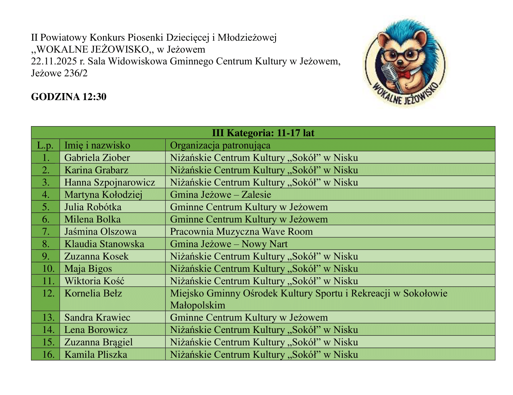 🎤✨ Prezentujemy kolejność występów podczas II Powiatowego Konkursu Piosenki Dziecięcej i Młodzieżowej „Wokalne Jeżowisko” w Jeżowem! ✨🎤