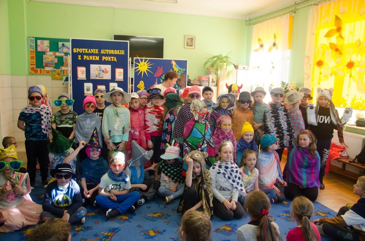1 kwiecień - Prima Aprillis ale zaproszony przez Bibliotekę Publiczną w Jeżowem Gość nie spłatał nam figla i jeszcze przed pierwszym dzwonkiem na lekcje przyjechał na spotkanie z dziećmi klas I-IV Szkoły Podstawowej w Jeżowem-Centrum. Tym Gościem był dziś, piszący dla dzieci wierszowane bajki o ptakach - Pan Poeta. Przybyły bardzo wysoki Pan "pod muszką", nie zdradził dzieciom jak się nazywa, niemniej jednak przeprowadził z dziećmi nie tylko tradycyjne spotkanie z czytaniem własnych bajek, wyciąganiem wynikających z nich wniosków, ale przeprowadził "Wielkie Shaw" z przywiezionymi ze sobą pacynko-ptakami, które posadził na szkolnych krzesełkach. Pan Poeta przywiózł ze sobą oprócz tego, dwie walizki rekwizytów które posłużyły dzieciom na przebranie podczas kreatywnych zabaw. Dzieci mogły nakarmić pacynkokurę zdrowymi ale pluszowymi warzywami i owocami, mogły posłuchać szumu fal, które wydały wprawione w ruch, nadmuchane i wypełnione ziarenkami baloniki. Potrafiły zrobić wielki sztorm na morzu, który trudno było uspokoić. Dzieci przebierały się jak kolorowe pawie w piękne kapelusze, okulary i ciuszki.