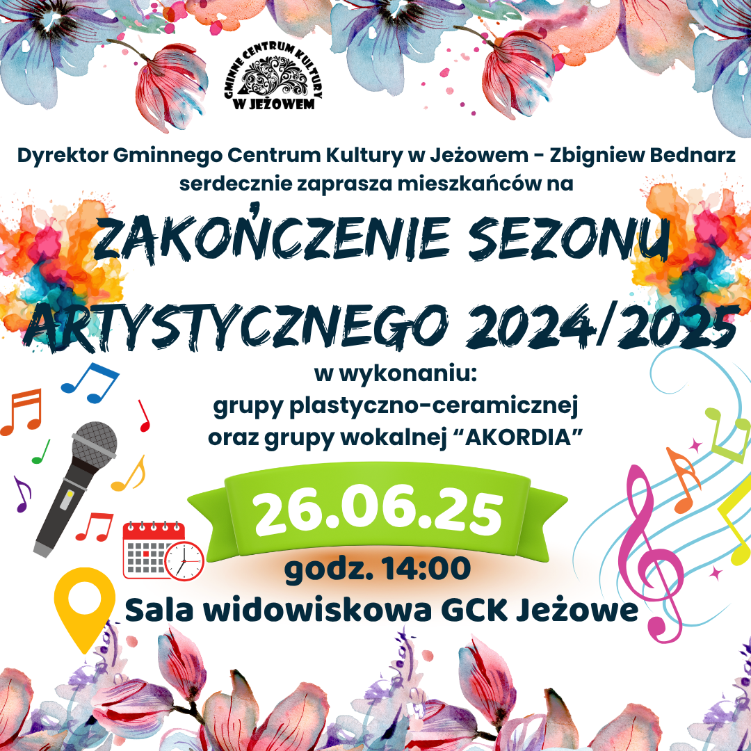 📣Dyrektor Gminnego Centrum Kultury w Jeżowem – Zbigniew Bednarz ma zaszczyt zaprosić wszystkich mieszkańców na wyjątkowe wydarzenie, które stanowić będzie zwieńczenie sezonu artystycznego 2024/2025. W programie, który odbędzie się 26 czerwca 2025 r. (czwartek) o godzinie 14:00 w sali widowiskowej Gminnego Centrum Kultury w Jeżowem wystąpią dwie grupy artystyczne: plastyczno-ceramiczna oraz wokalna “Akordia”.
