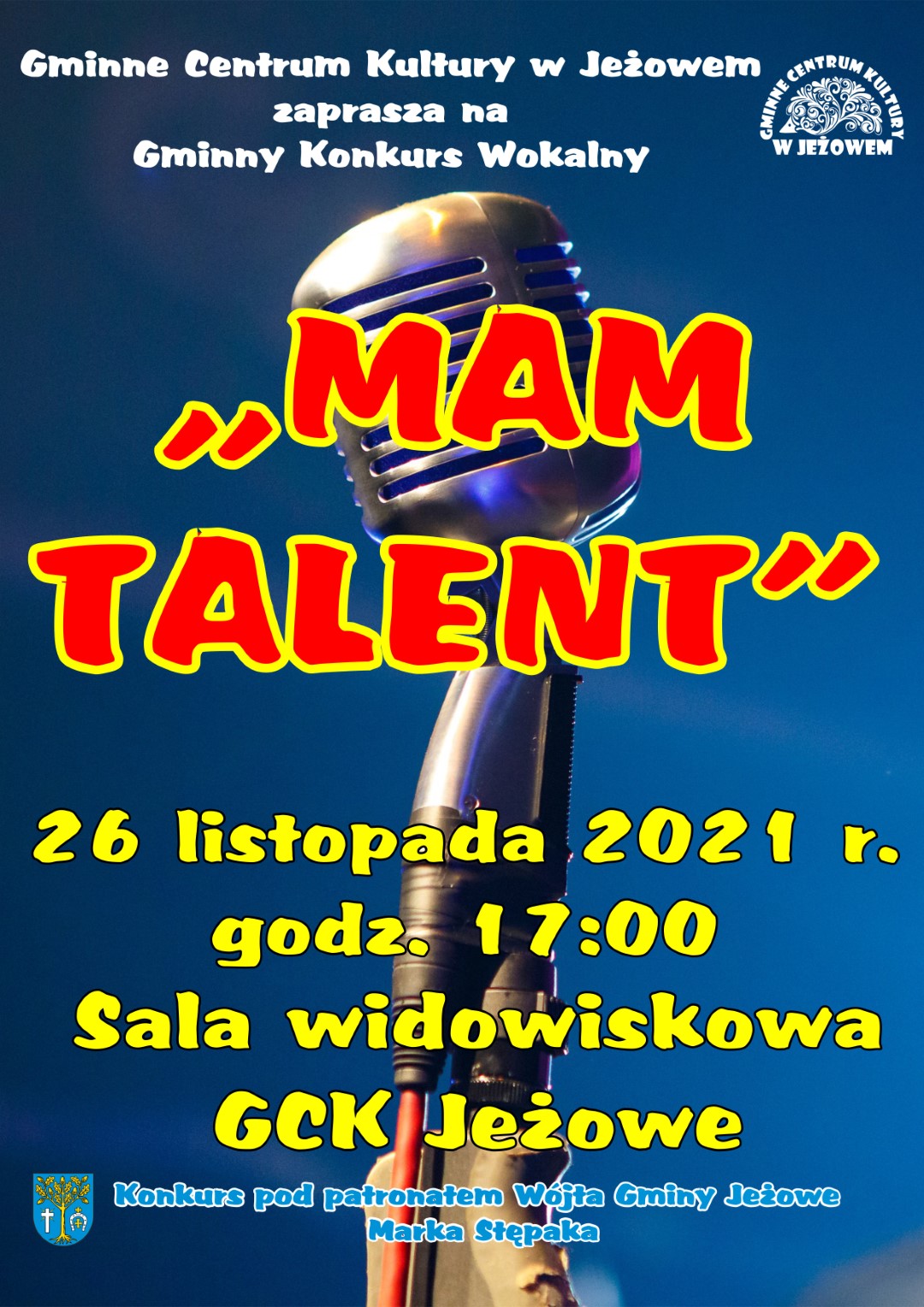 Gminny Konkurs Wokalny "MAM TALENT" 26 listopada 2021 r. godz. 17:00 sala widowiskowa GCK JEŻOWE