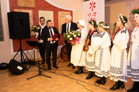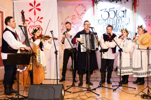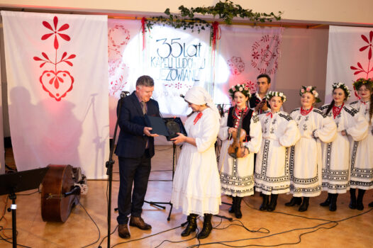 Nie tylko pokaz filmowy był zaplanowany na grudniowy wieczór. Nade wszystko można było ucieszyć ucho słuchając koncertu Kapeli na żywo. Wielkim atutem śpiewaków jest duża grupa pięknych, młodych, uśmiechniętych dziewcząt, które z zaangażowaniem podejmują "niedzisiejsze" zadanie wchodzenia w świat swoich prababć, a w jubileuszowym koncercie zaśpiewał zespół w składzie: Karolina Rychlak, Faustyna Piędel, Wiktoria Kozara, Karolina Matyka, Marta Piędel, Teresa Bąk, Adam Pietruszyński, a także Maria Kopacz - kierownik zespołu. Wielki szacunek i podziw budzić musi bardzo profesjonalna i pieczołowicie wykonana gra instrumentalistów: Tadeusz Matyka - akordeon, Magdalena Stępak- skrzypce, Jan Słoniec - klarnet, Tadeusz Kopacz - kontrabas. Z wdziękiem i energicznie zaśpiewały swoje lasowiackie nutki również dzieci - nadzieja na zachowanie tradycji lasowiackich w Jeżowem, które wraz z Rodzicami przyszły na Uroczystość: Róża, Łucja, Lena, Laura, Anielka, Antoś i Mateusz. Swój udział muzycznie zaznaczyli także wspaniali muzycy - Aleksander Nienajadło (akordeonista) i Janusz Nieckarz (trąbka i saksofon). Finalnym punktem jubileuszowego spotkania przed słodkim i kawowym poczęstunkiem było wręczenie upominków i kwiatów "Jubilatce" - Kapeli, jak wyraził się wójt Jeżowego Pan Marek Stępak. Podkreślił on wartość i znaczenie tradycji podtrzymywanych od lat przez Kapelę i zachwycił się efektami tej mozolnej ale i radosnej pracy. Dyrektor GCK pan Zbigniew Bednarz wręczając statuetkę na ręce kierownika Kapeli przyznał, że jest pełen podziwu dla twórców tego ogromnego zadania, czyli nagrania płyty i stworzenia 12 towarzyszących filmów (a swoją drogą, dyrektor wykonał sporą część tego zadania, bo zajmował się nagrywaniem i montażem filmów). Rozmach tego projektu podkreślił również przewodniczący Rady Gminy Jeżowe pan Marian Koc. Spotkanie i samo miejsce było pieczołowicie przygotowane. Dominowała symbolika lasowiacczyzny - symbol serca i natury. Na uwagę zasługuje także strona graficzna okładki nowiusieńkiej płyty, zaprojektowana przez Panią Annę Stępak z 12 utworami tchnącymi borczynowym dawnym życiem i zatytułowaną jak cały Jubileusz: "Hop siup, tralala - lasowiackie granie".