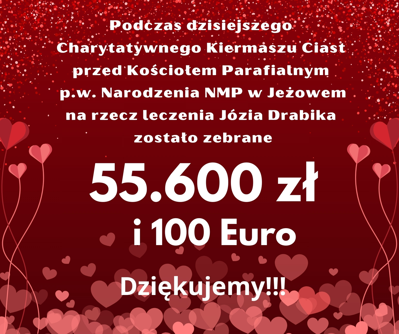 Podczas dzisiejszego Charytatywnego Kiermaszu Ciast przed Kościołem Parafialnym p.w. Narodzenia NMP w Jeżowem na rzecz leczenia Józia Drabika, została zebrana suma 55.600 zł i 100 Euro. Ogromne słowa wdzięczności dla ofiarodawców i darczyńców oraz podziękowanie i wyrazy uznania dla wszystkich zaangażowanych w zbiórkę, organizatorów kiermaszu, Stowarzyszenie Kobiety Z Pasją, Stowarzyszenie "Podgórzanie", Michał Piędel - Radny gminy Jeżowe, Mariusz Kępa, Drużyna Harcerska "Watra" na czele z Panią Bogusławą Pikor, ks. Proboszcz Jan Kardaś, Parafialny Zespół Caritas z Grobel, innych stowarzyszeń, organizacji społecznych i osób prywatnych. Dziękujemy za Wasze wsparcie, zaangażowanie i otwarte serca! 💓
