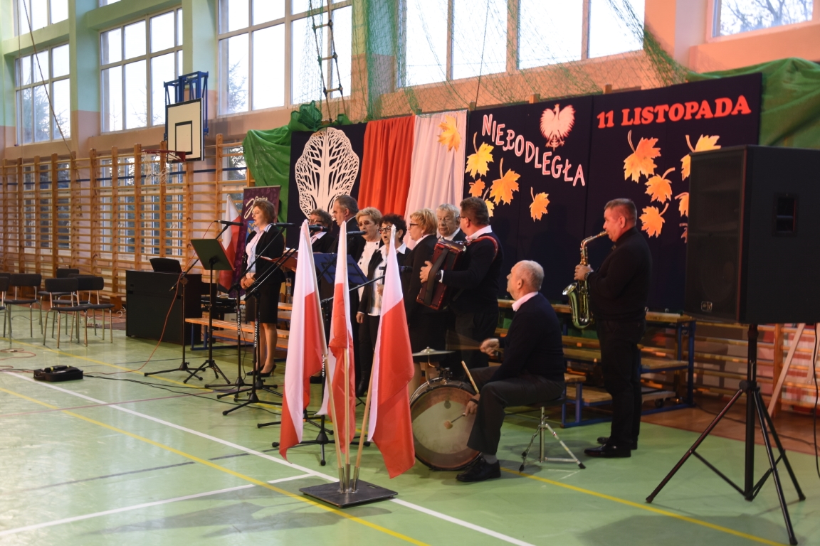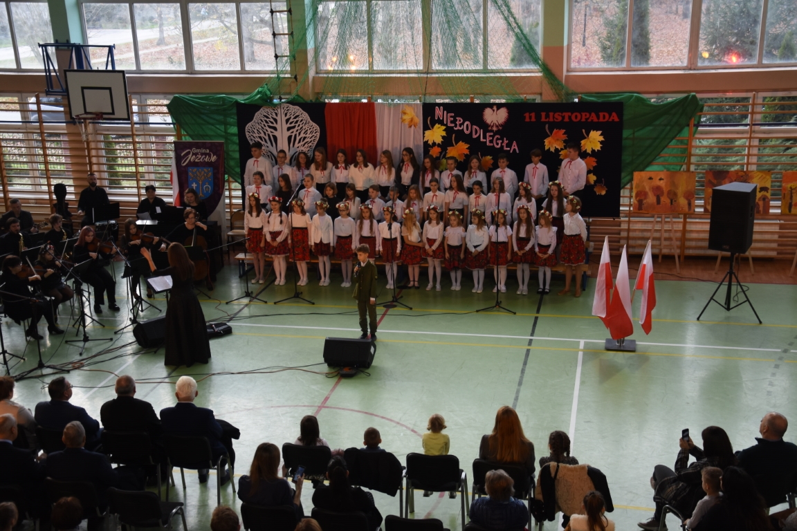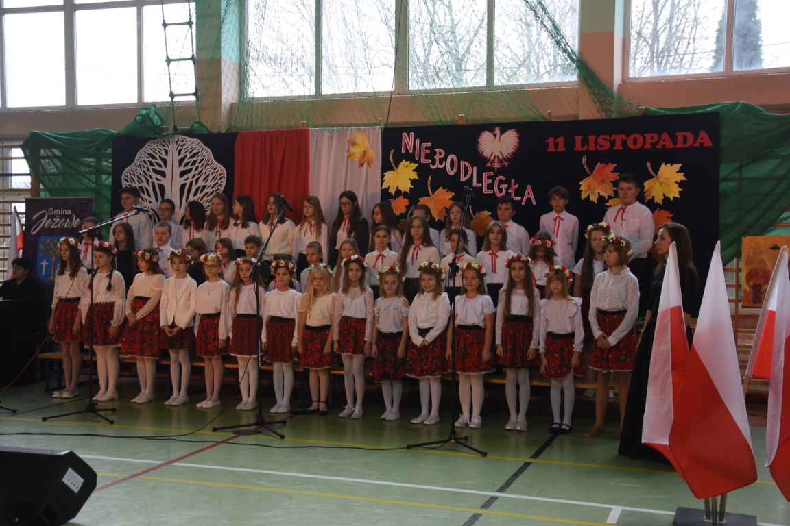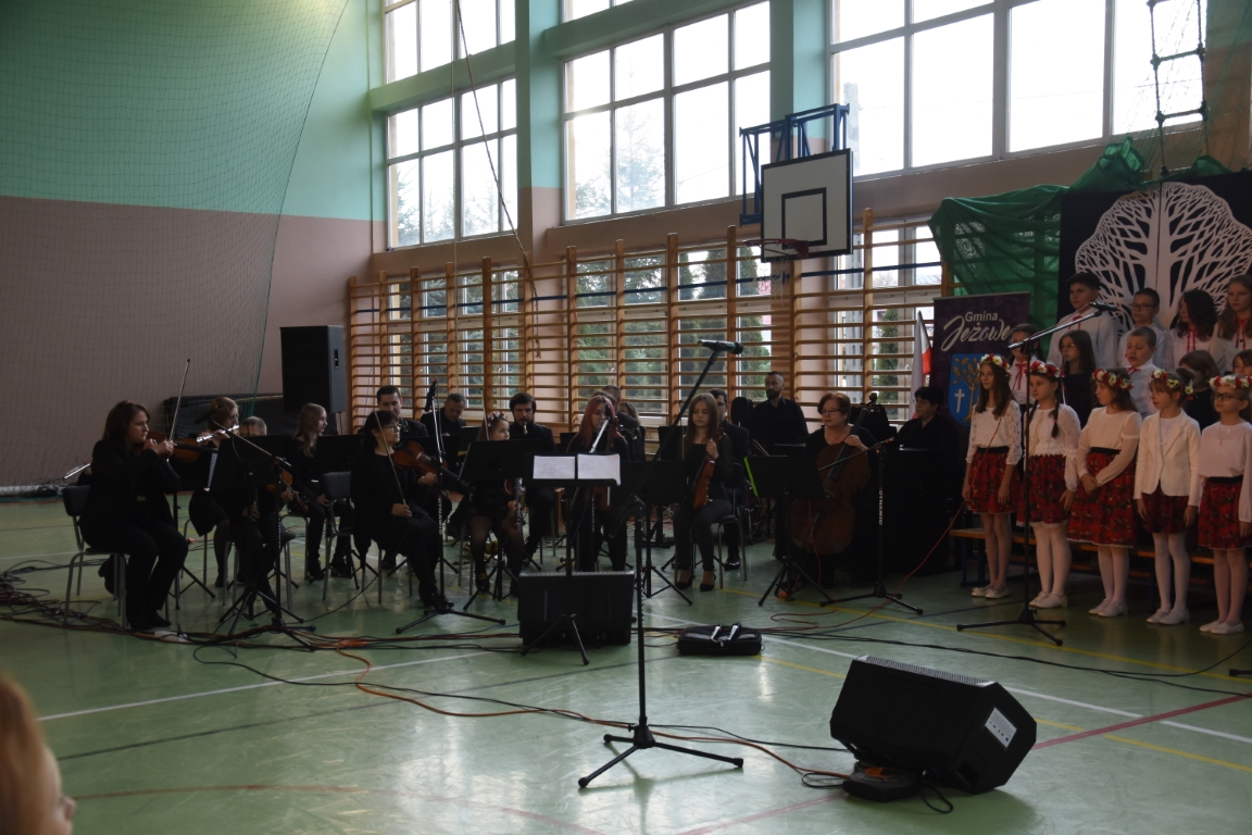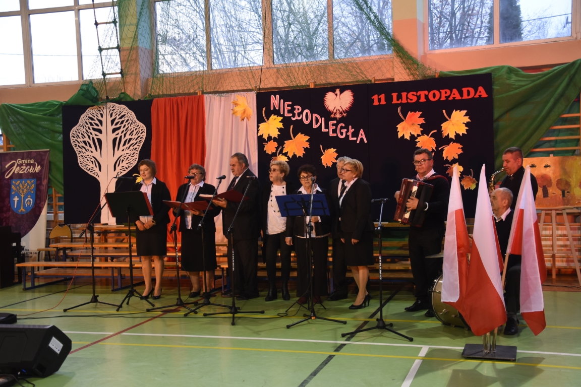 Tegoroczny Dzień Niepodległości w naszej gminie wypełniony był przede wszystkim śpiewem i muzyką. Pierwszą część obchodów, zorganizowaną w budynku Samorządowej Szkoły Muzycznej, stanowił koncert patriotyczny w wykonaniu orkiestry i chóru Samorządowej Szkoły Muzycznej w Jeżowem oraz zespołów związanych z Gminnym Centrum Kultury – grupy wokalnej, zespołu śpiewaczego „Jeżowianie” oraz kapeli ludowej „Jeżowianie”. Tego popołudnia usłyszeliśmy najpiękniejsze polskie pieśni i piosenki patriotyczne, w których śpiew włączała się także licznie zgromadzona publiczność. W roli gospodarza imprezy wystąpił dyrektor SSM, pan Marek Sękiel, zaś do przybyłych gości słowo końcowe skierował Wójt Gminy Jeżowe, pan Marek Stępak.