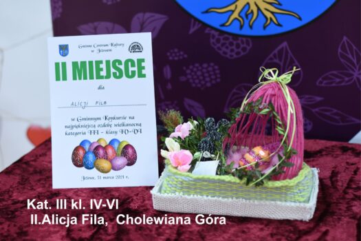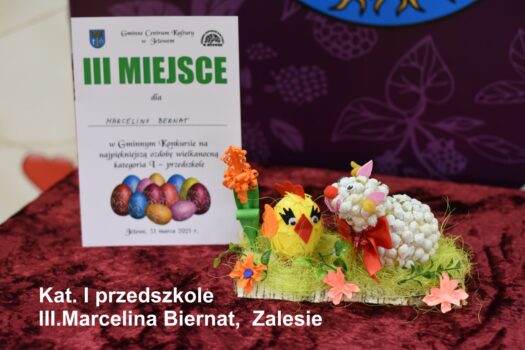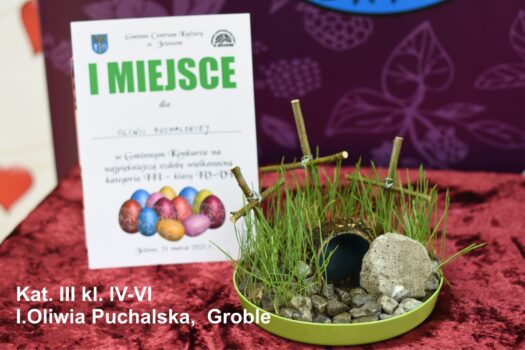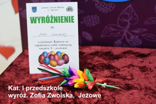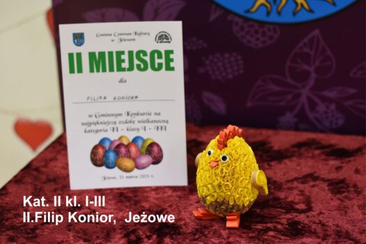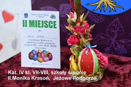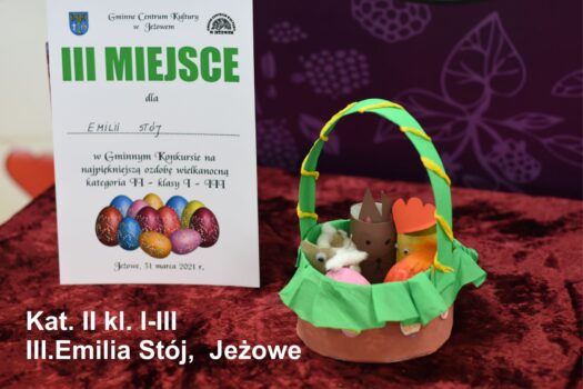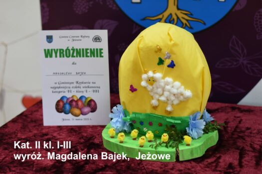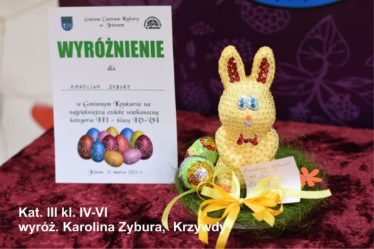 Po odbiór nagród i dyplomów prosimy zgłaszać się jutro (środa 31.03.2021) od godz 12.00 do 17.00. Wszyscy chętni mogą także zabrać przygotowane przez siebie ozdoby. Ozdoby nie odebrane przechodzą na własność GCK Jeżowe.