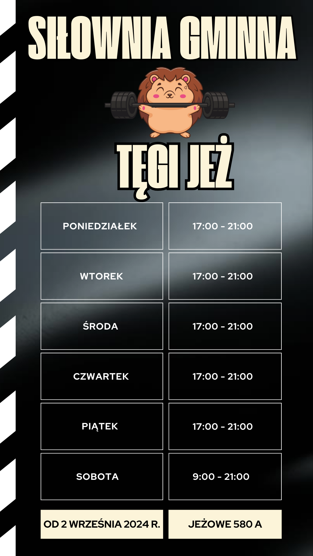 Od 2 września siłownia czynna poniedziałek do piątek od 17.00 - 21.00 Sobota od 9.00 - 21.00
