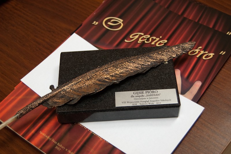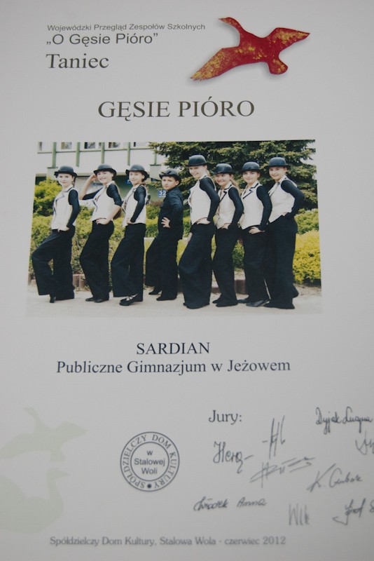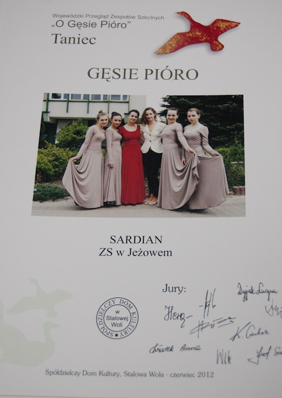 Zespół taneczny Sardian po raz drugi z rzędu zdobył pierwsza nagrodę "Gęsie pióro" na VIII Wojewódzkim Przeglądzie Zespołów Szkolnych "O Gęsie Pióro" organizowanym przez SDK w Stalowej Woli. W ubiegłym roku osiągneliśmy niespodziewany sukces zdobywając pierwsza nagrodę, a tym roku potwierdziliśmy wysoki poziom zespołu zdobywając ją po raz drugi. Jest to druga znacząca nagroda w tym roku po wyróżnieniu na wojewódzkim przeglądzie w Głogowie Małopolskim. Obserwując rozwój zespołu przez ostatnie kilka lat mogę śmiało powiedzieć iż zespół nigdy nie prezentował tak wysokiego poziomu technicznego i artystycznego.