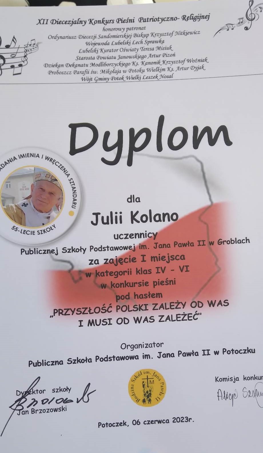 Julia Kolano (uczęszczająca na zajęcia wokalne w GCK) zajęła I miejsce w kategorii klas IV-VI w XII Diecezjalnym Konkursie Pieśni Patriotyczno-Religijnej. Julia reprezentowała Publiczną Szkołę podstawową im. Jana Pawła II w Groblach Gratulujemy.