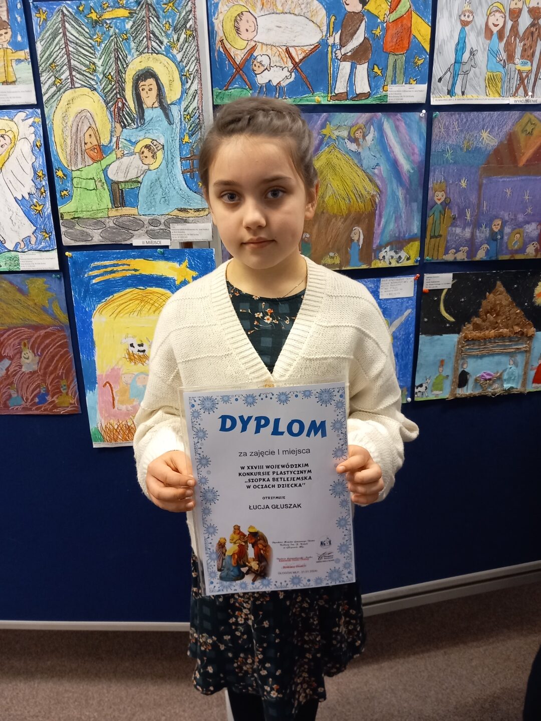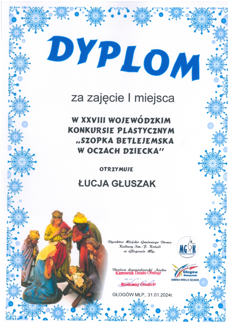 W dniu 31 stycznia 2024 r. odbyło się wręczenie nagród w XXVIII Wojewódzkim Konkursie Plastycznym „Szopka Betlejemska w oczach dziecka” zorganizowanym przez Miejsko Gminny Dom Kultury w Głogowie Małopolskim. Podopieczna zajęć plastycznych Łucja Głuszak zajęła w nim I miejsce. Serdecznie gratulujemy ogromnego sukcesu. Do konkursu przygotowała Pani Instruktor GCK Małgorzata Żoczek.