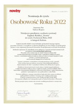 Miło nam poinformować że mieszkaniec naszej Gminy Jeżowe, Pan Tadeusz Kopacz otrzymał nominację Kolegium Redakcyjnego Gazety Codziennej NOWINY do tytułu Osobowość Roku 2022 w kategorii Kultura. Zachęcamy do głosowania które trwa do 23 lutego 2023. Szczegóły i głosowanie pod linkiem