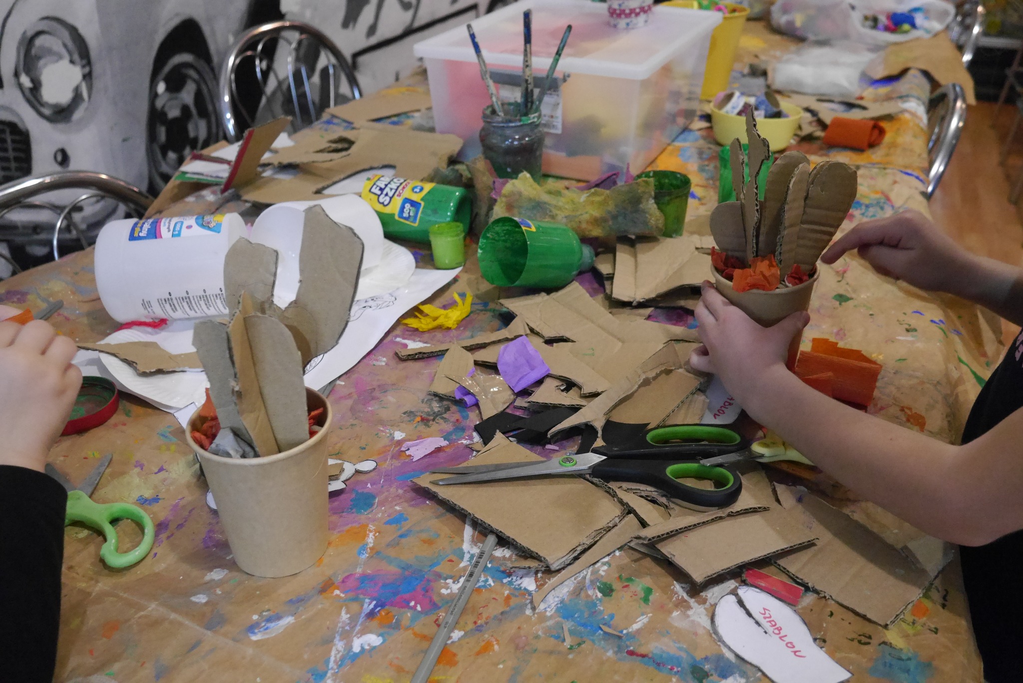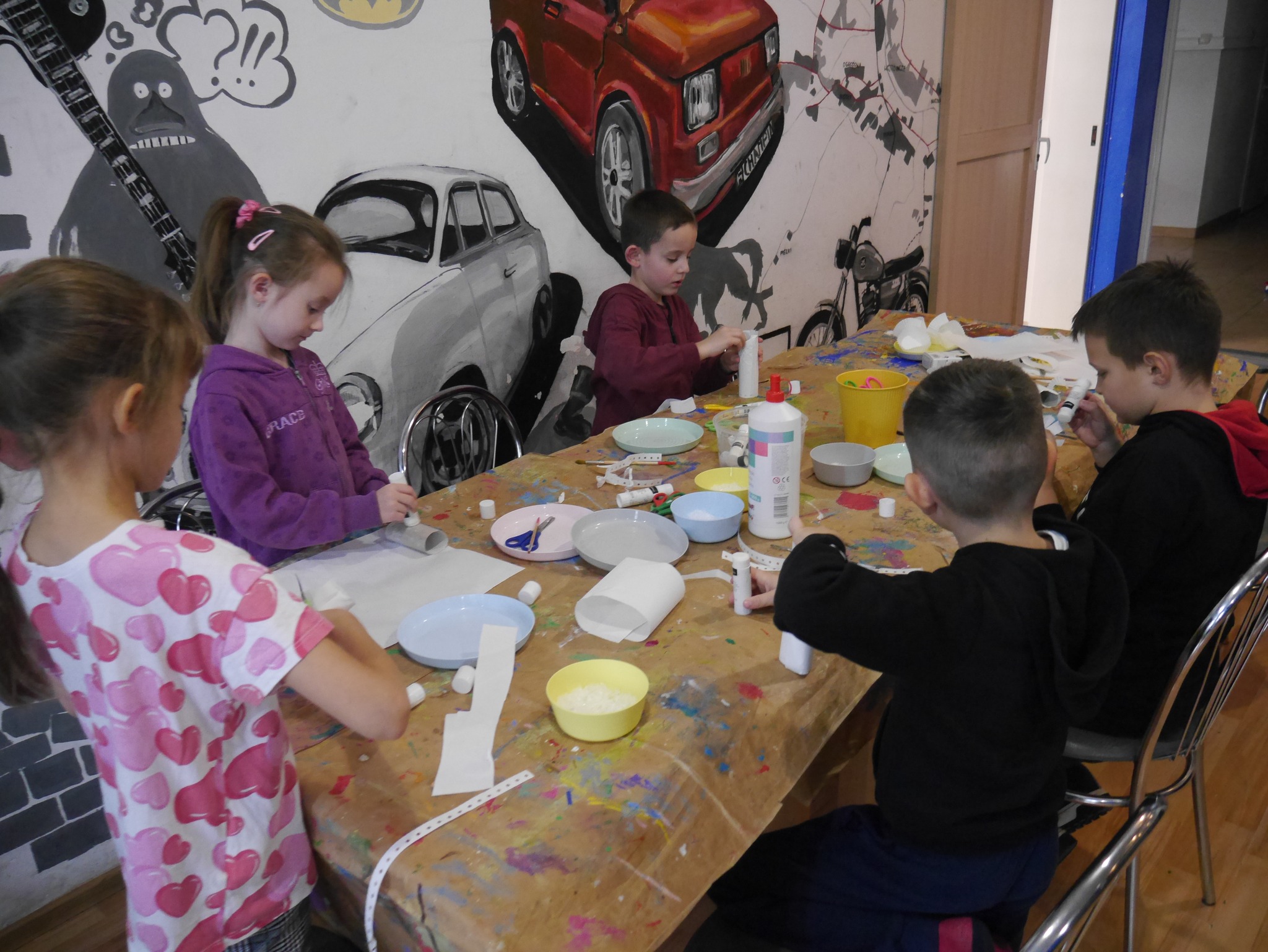 Poprzez twórczą pracę plastyczną uczczone zostało również Święto Niepodległości – dzieci przygotowały patriotyczne Godła Polski wyklejane piórami. Na parapetach świetlicy pojawiły się także małe kaktusy z tektury i bibuły, umieszczone w papierowych kubeczkach. Wyobraźnia uczestników poszybowała wysoko, czego efektem było stadko żyraf narysowanych na długich arkuszach papieru, a także pomysłowe zebry powstałe z rolek po ręcznikach papierowych, którym nadano drugie życie.