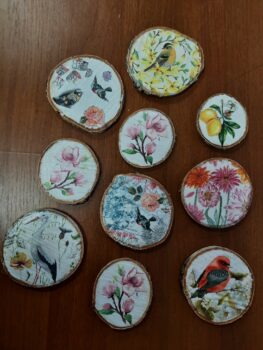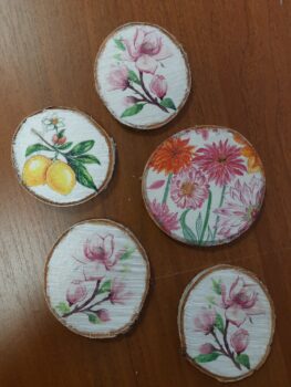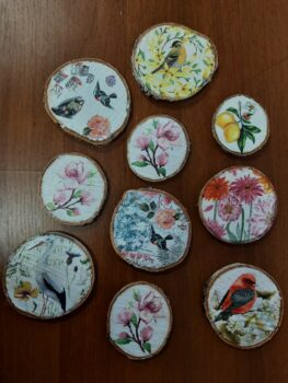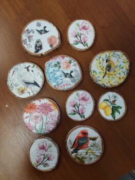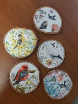 Podkładki pod kubek wykonane metodą decoupage na plastrze brzozowego drewna