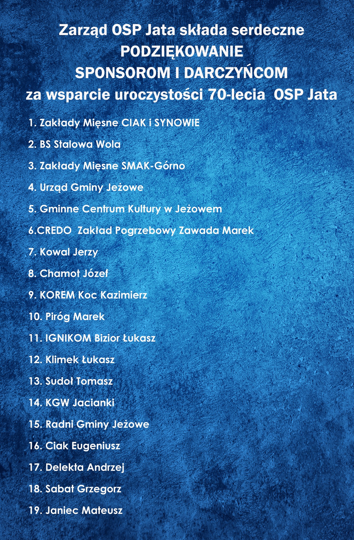 Zarząd OSP Jata na czele z Prezesem Janem Sudołem w imieniu wszystkich strażaków składa serdeczne podziękowania sponsorom i darczyńcom za wsparcie organizacji Uroczystości Jubileuszu 70- lecia OSP w Jacie. Z całego serca dziękujemy !!!
